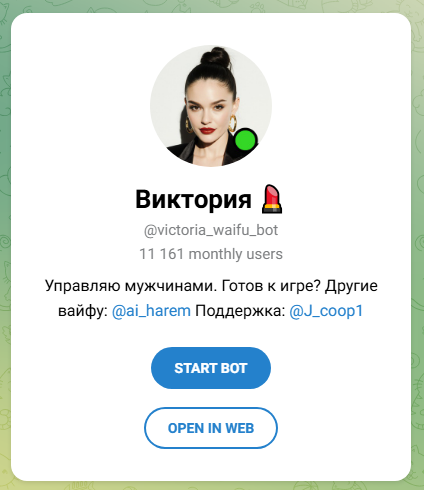 Здесь сразу чувствуется другой подход: не выбор из каталога, а один конкретный персонаж, проработанный по-настоящему детально. Виктория — это ИИ-собеседница с устойчивым характером, своим взглядом на вещи и манерой держать разговор. Это ближе к формату интим с девушкой один на один, чем к интернет-магазину персонажей. Именно за счёт этой камерности возникает то самое ощущение присутствия. Чат интим тг формата реализован здесь чисто: вход через Telegram, никаких лишних шагов, сразу в разговор. Для тех, кому нужен не ассортимент, а атмосфера.