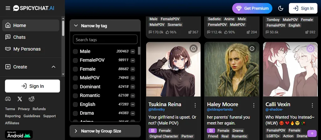 SpicyChat AI — тысячи персонажей с ролевыми сценариями и без жёсткой цензуры контента. Алгоритм помнит детали внутри ролевой игры и развивает нарратив. Для любителей вербальной игры с нарастанием.