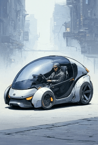 Катятся гладкие, словно облизанные, леденцово-стеклянные машины, одна из них останавливается, верх откидывается, внутри — рендовый киб-драйв с имплухой. Держится за руль, приветливо кивает, машет приглашающе рукой.