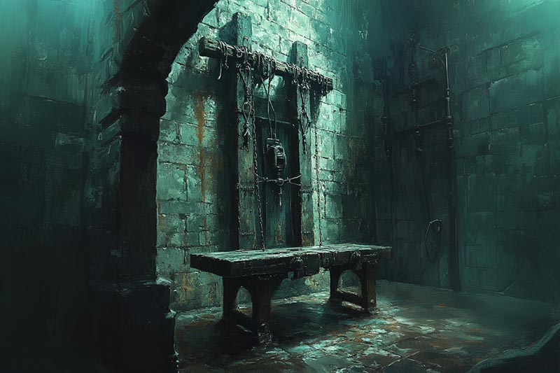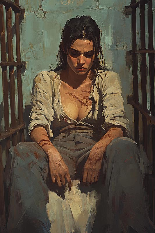 Девушка сидит в узкой камере с решётками. Лицо потерянное и отчаявшееся, одежда разорвана, спутанные грязные волосы, глубокие царапины на груди и руках — и пронзительно синие глаза.