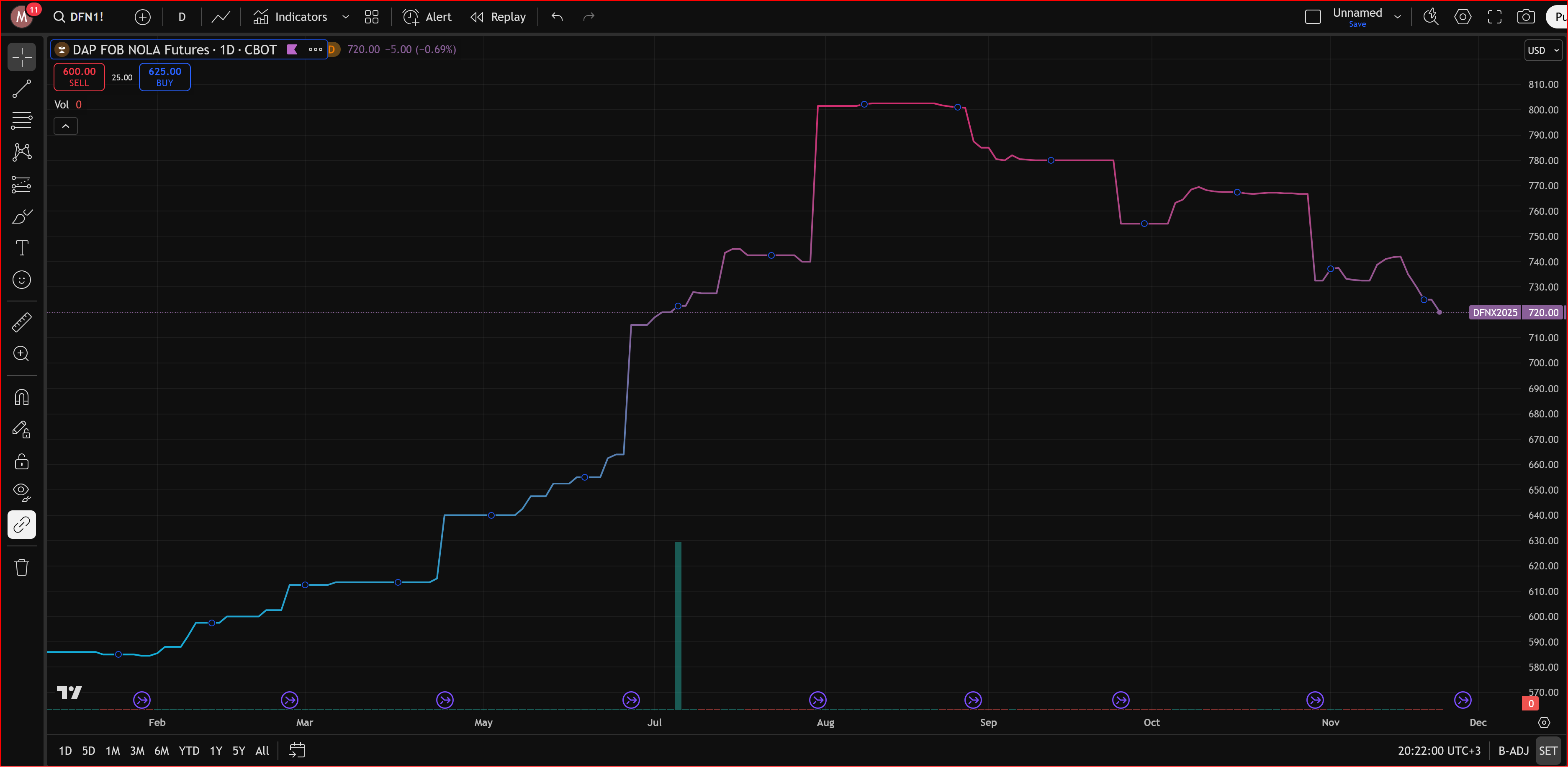 Фьючерсы DAP FOB NOLA (диаммонийфосфат, поставка на условиях FOB, Новый Орлеан, Луизиана) являются ключевым бенчмарком для мирового ценообразования и управления рисками на рынке удобрений. Снижение последнее время (см. график)