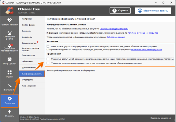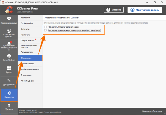 5. Запустить CCleaner и перейти на вкладку «Параметры» > «Обновления». Там снять обе галочки, как на скриншоте: