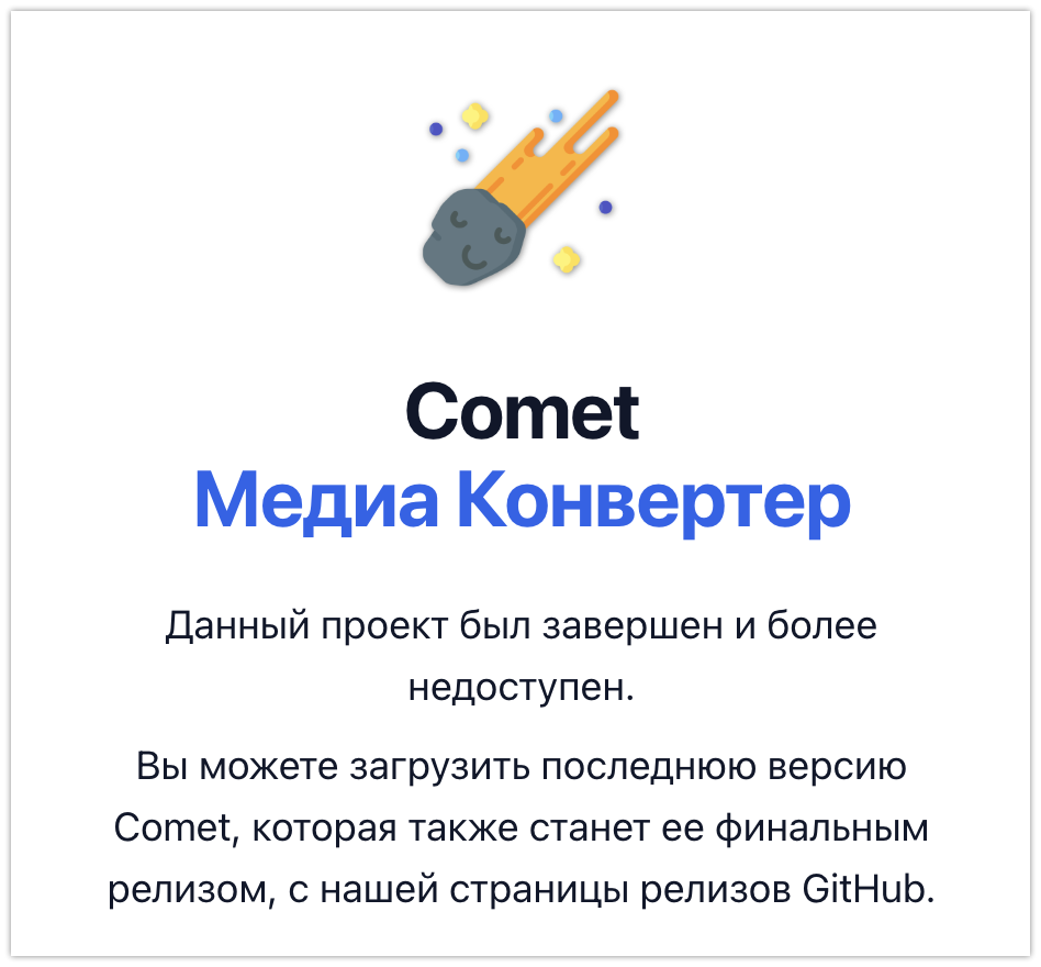 После долгих раздумий я решил отказаться от Comet в его нынешнем виде, чтобы освободить место для нового, более профессионального инструмента для конвертации медиа. Хотя Comet был невероятным путешествием — из простой идеи превратился в полнофункциональное кроссплатформенное приложение — я считаю, что пришло время вывести вещи на новый уровень.