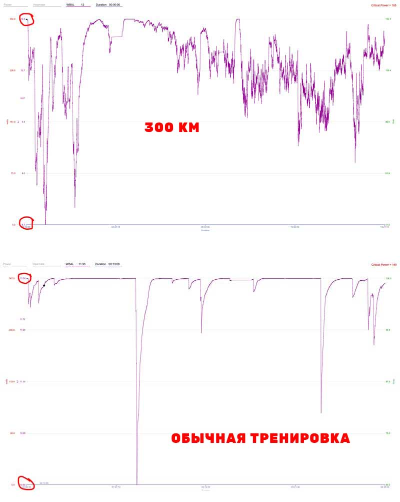 Как видно, на 300-ке я ехал без полного восстановления — диаграмма «зубчатая». Конечно, следуя этому графику, я мог еще немного добавить по мощности, чтобы моя энергия закончилась (упала до нуля), но в таком случае я должен был бы долго восстанавливаться после такой работы или остановиться и дождаться, пока моя энергия восстановится.