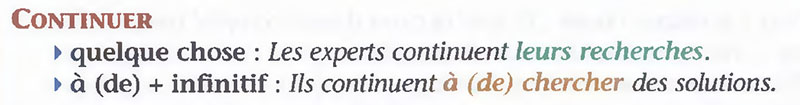 «Continuer de», используется для обозначения некоего привычного действия, которое когда-то началось (и вы не знаете когда точно) и не «перестает делаться — ne cesse pas de faire». Pas de faire — это второй индикатор.
