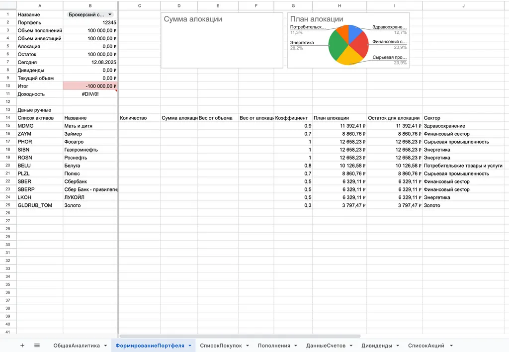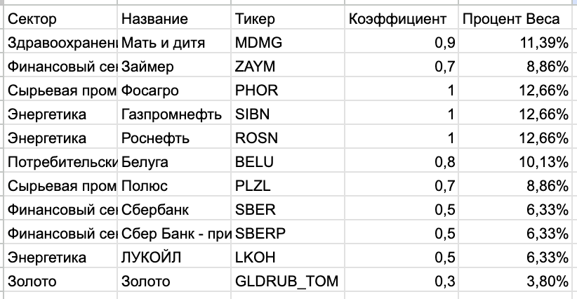 В конечном итоге, Неля решила, что выберет часть компаний из списка выше и часть добавит от себя, а далее проставит им коэффициент веса в портфеле, основываясь на своем понимании рынка и готовности к риску. Для этого она будет использовать гугл таблицу, которая впоследствии станет аналитической таблицей по портфелю.