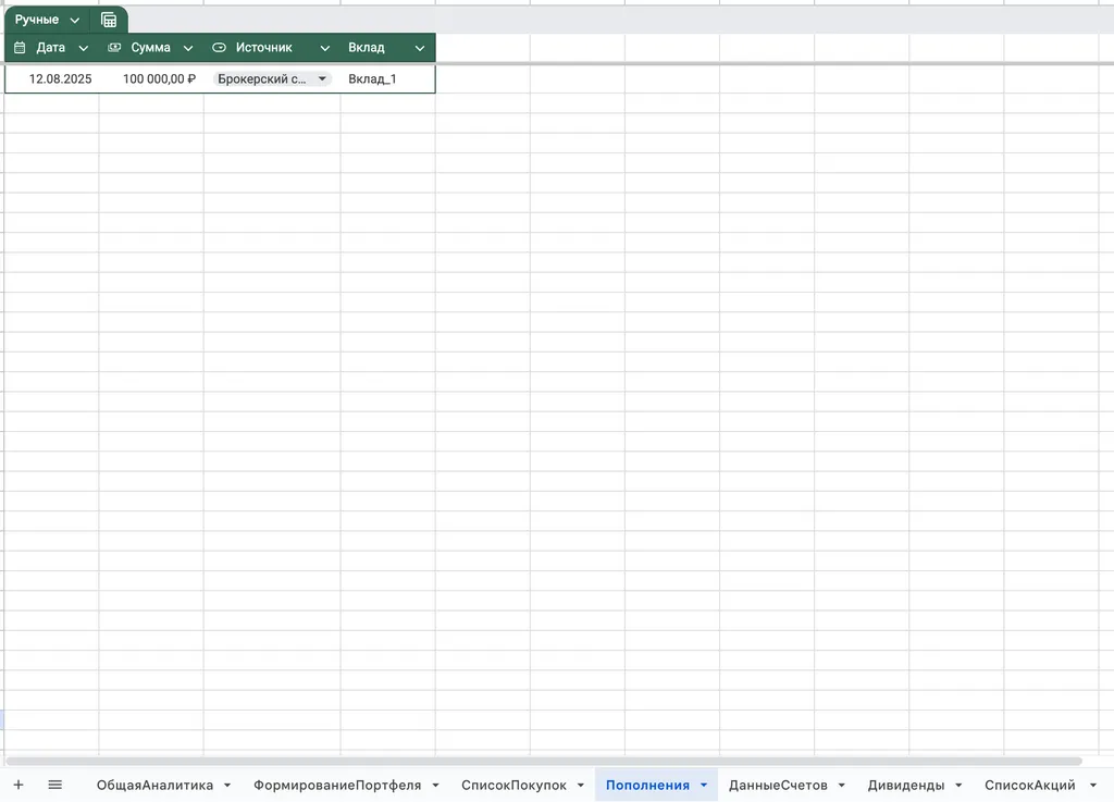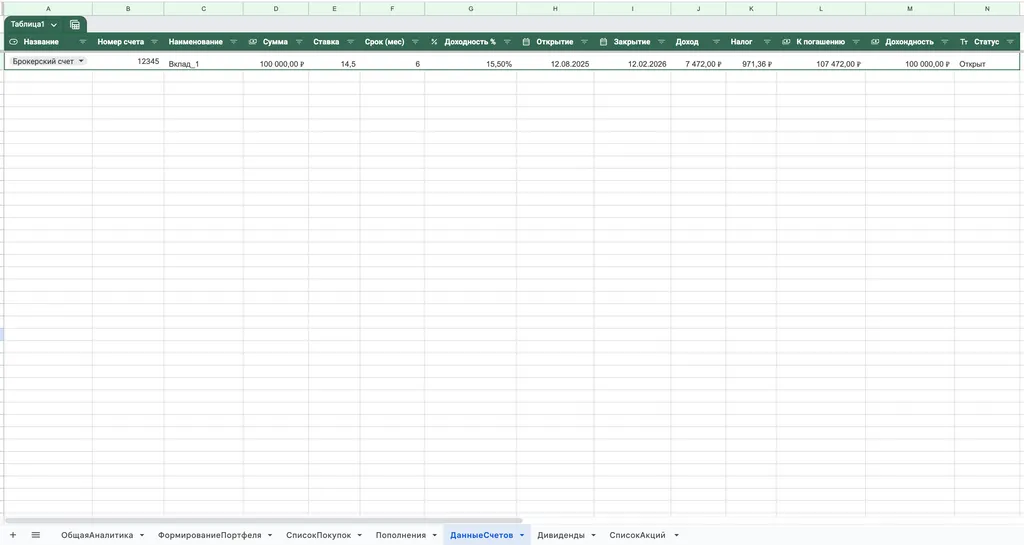 Неля решила, что будет вести отдельно гугл таблицу, т. к. данные, которые отображаются в приложении брокера не всегда информативны и со временем показывают иные данные, которые не позволяют корректно сравнивать доходность относительно тех же вкладов.
