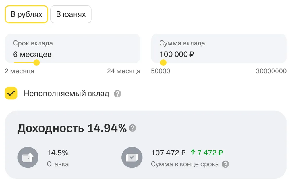В Данные вклада фиксируются: срок / сумма / ставка / сумма на конец срока (остальное считается автоматически по формулам)