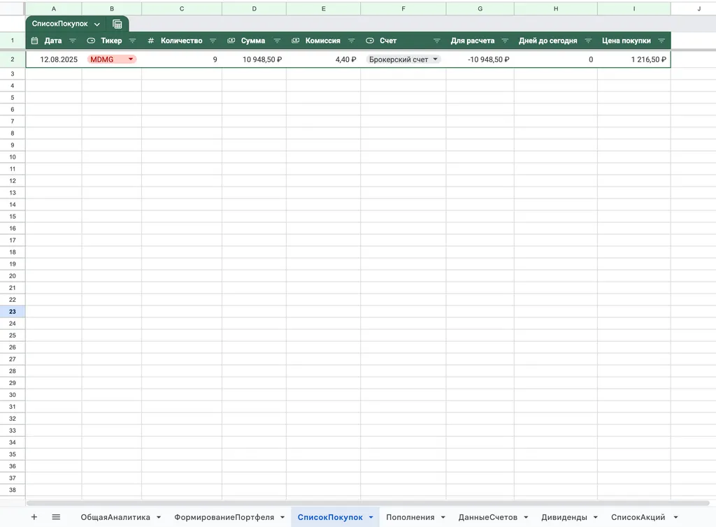 В поле «Доступно» указывается возможное количество к покупке исходя из суммы на брокерском счету. У Ивана на данную акцию план аллокации 11 392,41 ₽, с учетом стоимости акций он может купить 9 штук. После покупки, эти данные необходимо внести в таблицу: