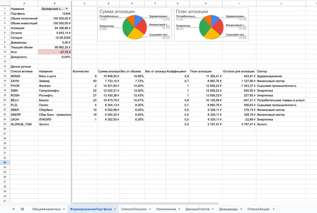 Как видно из таблицы, где-то ввиду лотности был небольшой выход за бюджет, а например «Золото» купить не удалось, т. к. минимальный лот стоит 8514 ₽ (поэтому золото будет покупаться, когда сумма пополнений будет увеличена и дойдет до нужного объема)