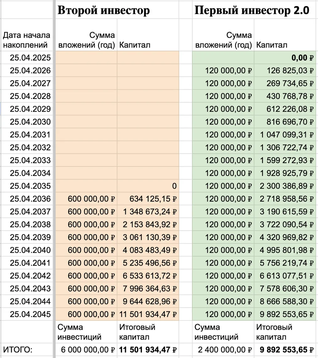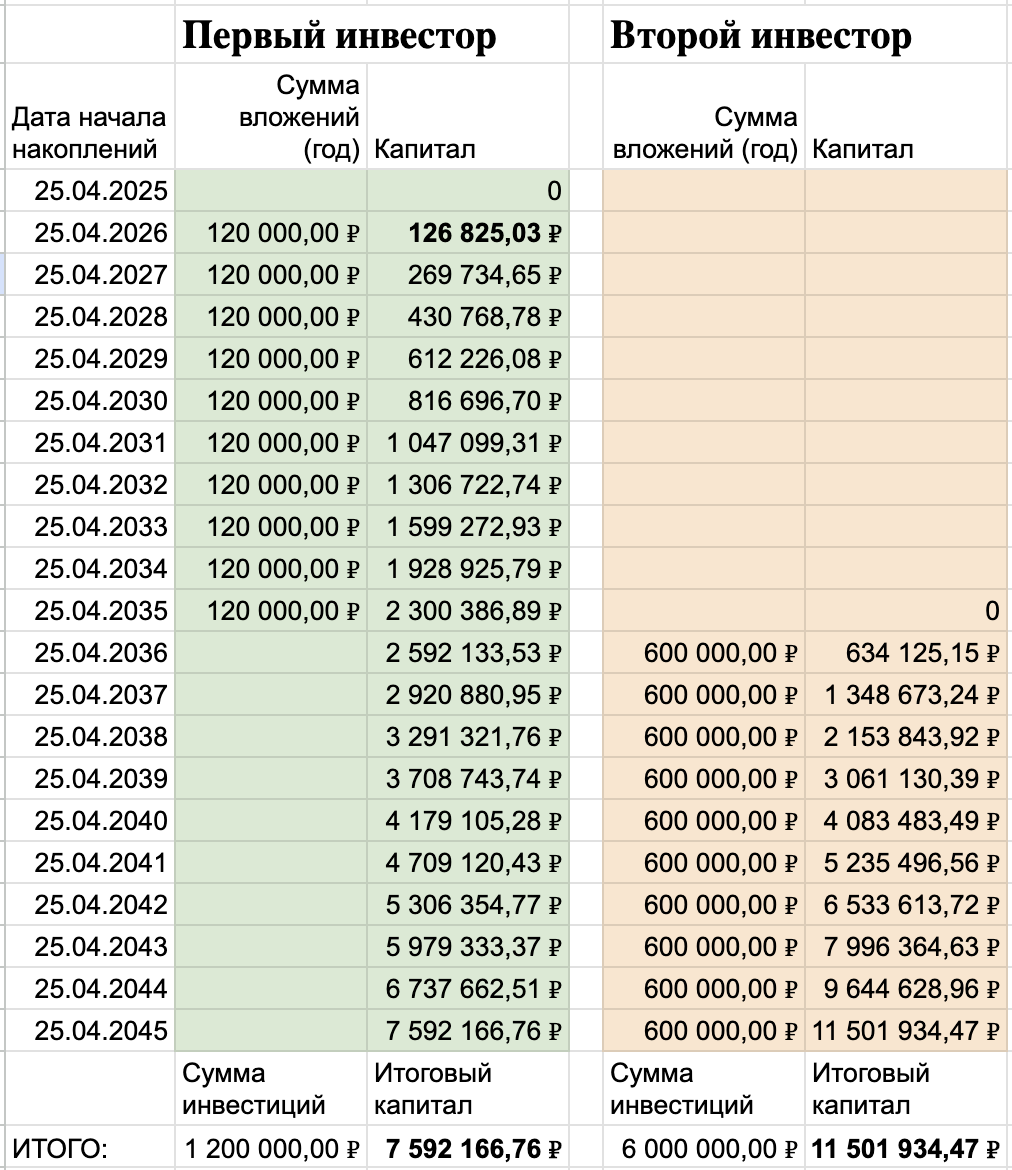И хотя мы видим что по итогу у второго инвестора капитал больше на 1/3, но надо не забывать важный фактор, что второй инвестор в общей сумме инвестировал в 5 раз больше первого. А первый в свою очередь после 10 лет решил остановиться. А что было бы в случае когда первый инвестор не останавливался в инвестициях и все так же вносил по 10 000 ₽