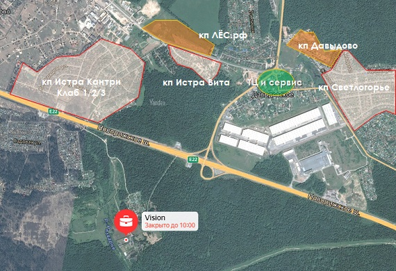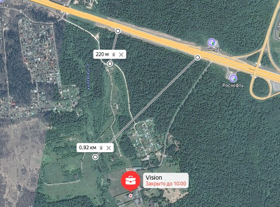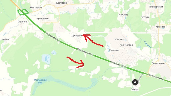 Если вы забьете в навигаторе кп Vision и построите маршрут из Москвы, то увидите вот такую картинку с расстоянием от МКАД аж 62 км.