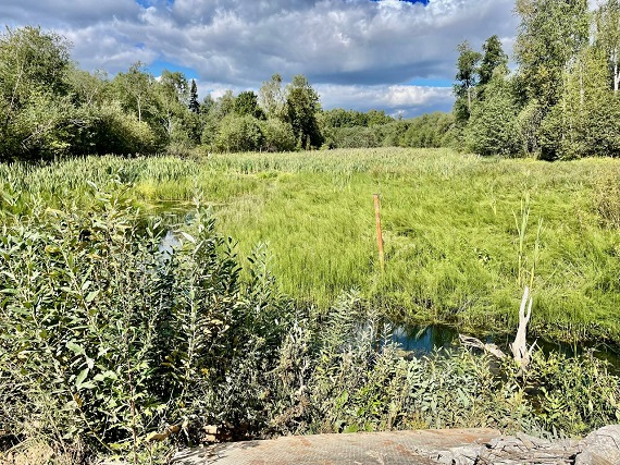 Обустроенная по максимуму общественная зона вдоль реки. Болото будет расчищено, и будут сделаны каскадные каналы.