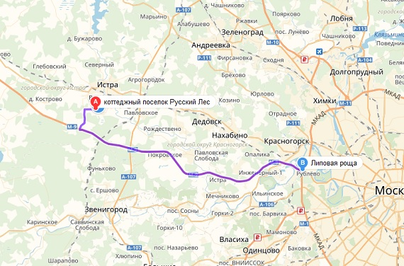 Русский лес расположен на расстоянии 46 км от МКАД и 5 км от Истры.