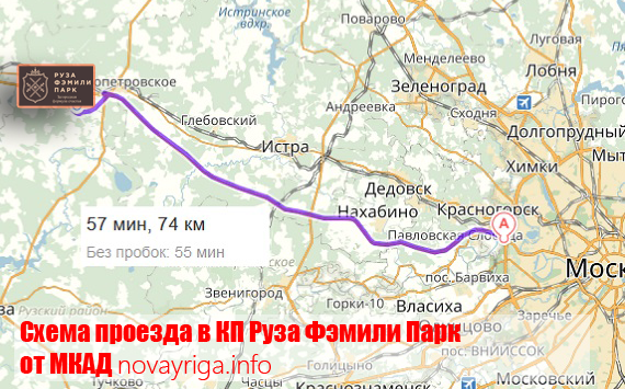 КП Руза Фэмили парк расположен на Новорижском шоссе в районе деревни Рождествено/Андрейково.
