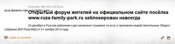 P. S. В конце концов таки нашел в кэше Яндекса остатки заблокированного блога борцов с ДНП Руза-КМД ruzafamily-park.livejournal.com, но оказалось — банальная скукота. Цитировать нет смысла. Единственно, там отыскался ответ про форум жителей. Он оказывается был на сайте застройщика, но из-за постоянных склок его заблокировали.