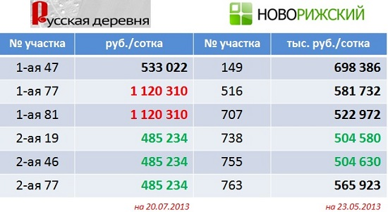 Участки 1-77 и 1-81 расположены возле лесного массива. Отсюда заметно более высокая цена, все остальное вполне сопоставимо с предложением в Новорижском. А ведь находится КП Русская деревня в более тихом и привлекательном месте.