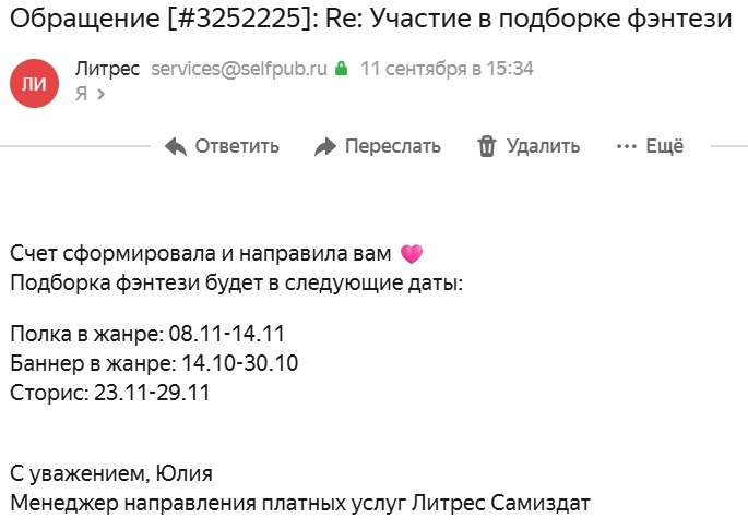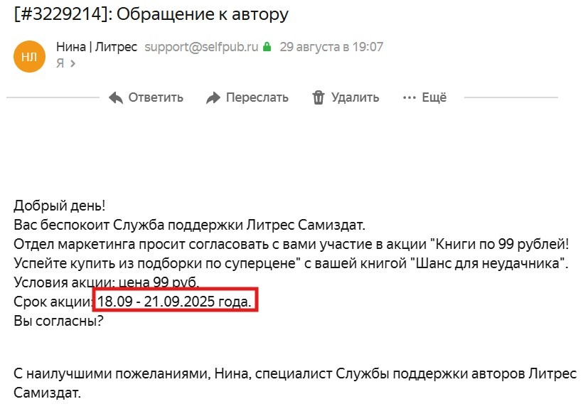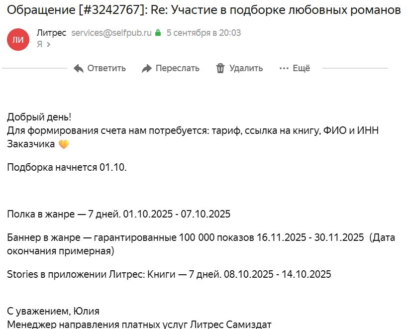 И вот приходит мне однажды 5 сентября 2025 года предложение из рассылки «Литрес» для рекламирования моего любовного романа.