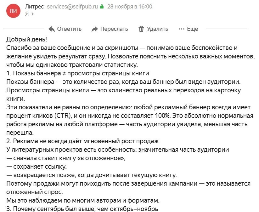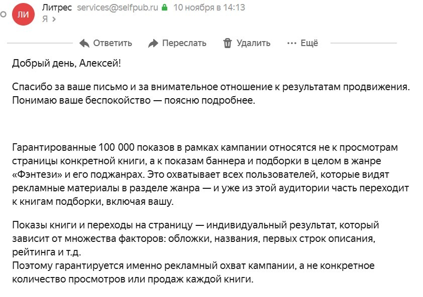 Что вам посоветовать? Ищите иные площадки для рекламы, если есть лишние деньги. И самый очевидный, хоть и с натяжкой, вариант — реклама в «Яндекс.Директе». Деньги там потратите НАМНОГО меньше, а выхлоп будет больше, чем за многие тысячи рублей вы получаете в «Литрес» единичные случаи профита, которые и 10% не окупают.