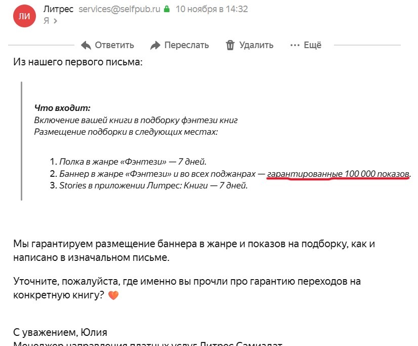 Моё разгневанное письмо администраторам «Литрес» повлекло ответное действие. Вот их наглый и циничный ответ от некой Юли.
