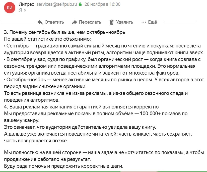 Единственный вариант, который может стать эффективным для рекламы именно в «Литрес», — это удачная попытка попадания в число счастливчиков в их «Календаре акций». Видимо, тема со скидками и привела к тем показателям в сентябре, которые и стали аргументом против бесполезных вложений в платную рекламу.